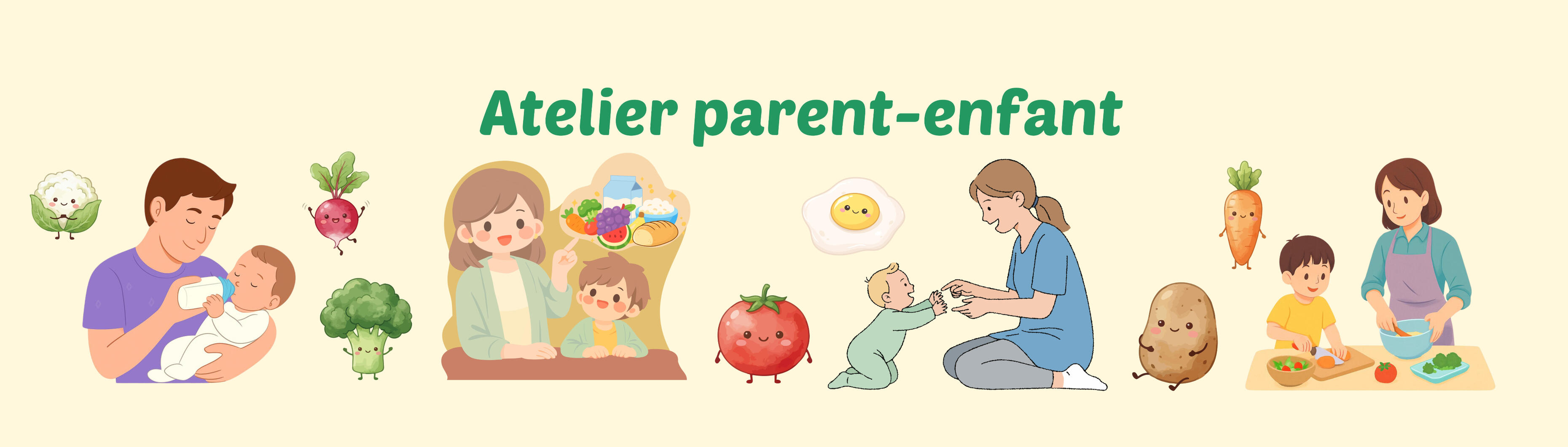 Les enfants explorent le monde en jouant et en manipulant, pendant que les parents profitent d’un temps d’échange serein et enrichissant autour de l’alimentation et de son importance pour la croissance et la santé.